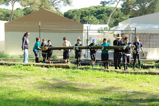 A formatura e hastear da bandeira são novamente em conjunto com os restantes agrupamentos e de seguida damos início às actividades do dia. A proximidade do parque permite-nos aproveitar as estruturas para uma gincana. A prova consistia em fazer um percurso em redes, atravessar uma ponte himalaia e finalmente descer no escorrega. Enquanto aguardavam, as outras patrulhas aproveitavam o slide, a cama elástica e o espaço do parque para brincar. Ainda havia tempo para um jogo, uma adaptação do Assalto ao Castelo ao espaço e materiais disponíveis. Depois, uma pausa para cantar os Parabéns ao aniversariante Francisco Santos.